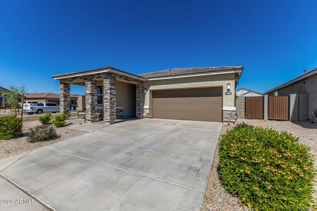 This beautiful 4-bedroom home in Mason Ranch II is the one! Nestled on a corner lot, it displays a low-care landscape, stone accent details, 2-car garage, & a cozy front porch. The fabulous interior showcases abundant natural light, a designer palette, tile flooring in common areas, and plush carpet in bedrooms. Designed for everyday living & entertaining, the seamlessly flowing open layout is sure to impress! The impressive kitchen boasts SS appliances, granite counters, a pantry, white shaker cabinets, and an island w/breakfast bar. Large main bedroom has an ensuite with a dual vanity & a walk-in closet. If you want to relax or have a fun gathering, the spacious backyard awaits you! A covered patio, artificial turf, and a play area complete the picture. Welcome home!
