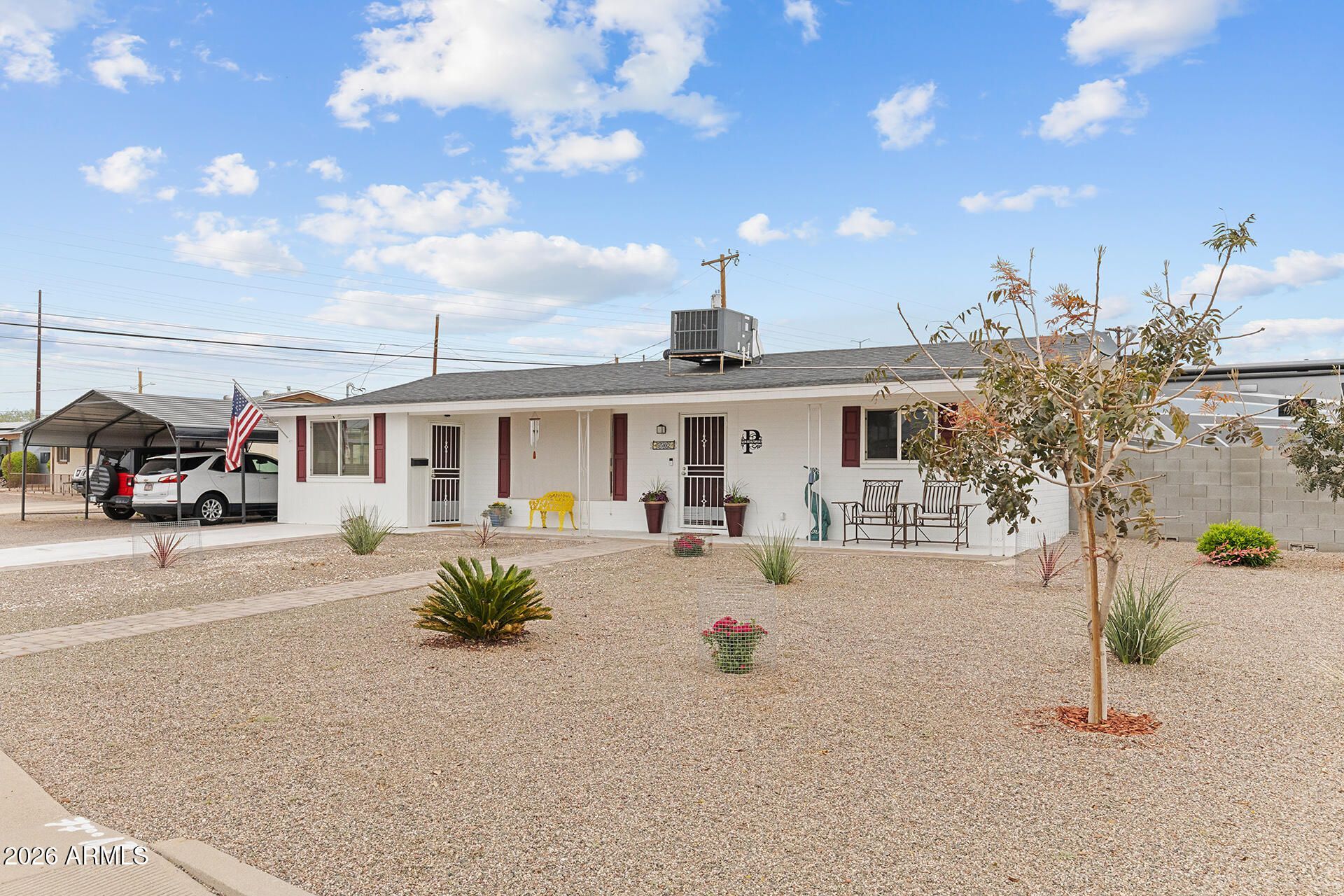Corner Lot & Move-in Ready in Dreamland Villa! Completely remodeled in 2022, this 3-bedroom home offers a spacious living & dining area that flows into the updated kitchen with stainless steel appliances, tile backsplash, extra cabinetry & a large pantry. Just off the kitchen, the oversized Arizona room with new flooring provides flexible space for a family room, office, hobby room or whatever best fits your needs. All three bedrooms feature new closets, plus updated windows throughout. The backyard is a great size with a blank slate for customization, plus a newly added utility shed & separate garden shed, an RV gate offering RV access & parking, while the front yard features a newly added 2-car carport. Situated on a corner lot with close proximity to Dreamland Villas voluntary HOA amenities, including pools, spa, pickleball courts, bocce ball, workout facility & community hall. Conveniently located with easy access to the US 60, plus nearby shopping, dining & recreation.