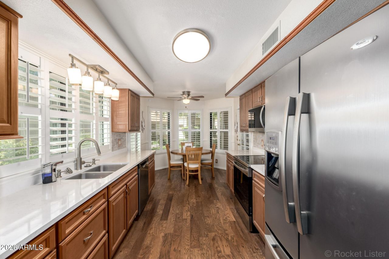 Beautiful end-unit townhome in Peorias sought after Cambridge Crossing neighborhood, offering 1,457 sq. ft. of comfortable living space with 2 bedrooms and 2 bathrooms. The main living areas showcase rich, real wood plank flooring, window shutters and lots of natural light. The updated kitchen features quartz countertops, new upper cabinets/refaced lower cabinets, a custom backsplash, stainless steel appliances (range/microwave only 2 years old) and a sunny breakfast nook. The spacious primary bedroom includes an en suite bathroom with dual vanity, shower and walk-in closet, while the secondary bedroom offers added flexibility with a Murphy bed. All appliances and a stackable washer are included, making this home truly move-in ready and ideal for year-round or seasonal living. Step out to a relaxing covered patio, and an extended uncovered area for perfect for grilling. Enjoy year round comfort with newer A/C (4-5 yrs.). Just a short distance from the community pool, spa, and ramada. Prime location with easy access to the 101 Freeway and close to shopping, dining, parks, golf, schools, and recreation!